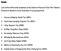 Short Film Festival (1 - 9 February 2008). Following Royston Tan’s win