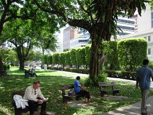 As we continue our journey, we can see an open area on our left. Dhoby Ghaut, a small road, used to cut across this place to the other road, Selegie Road, just where the man is walking. Can you see a curved line where he is walking? That's where the road was.