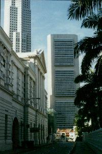 The statue of Raffles is at the end of this lane. The tall building in the centre of the photo is OCBC Centre.