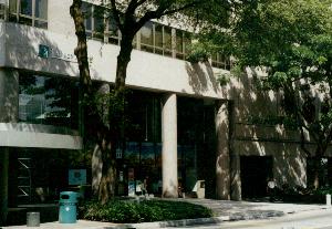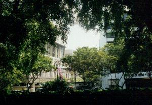 trees. The buildings are: on the left, Orchard Plaza; and on the