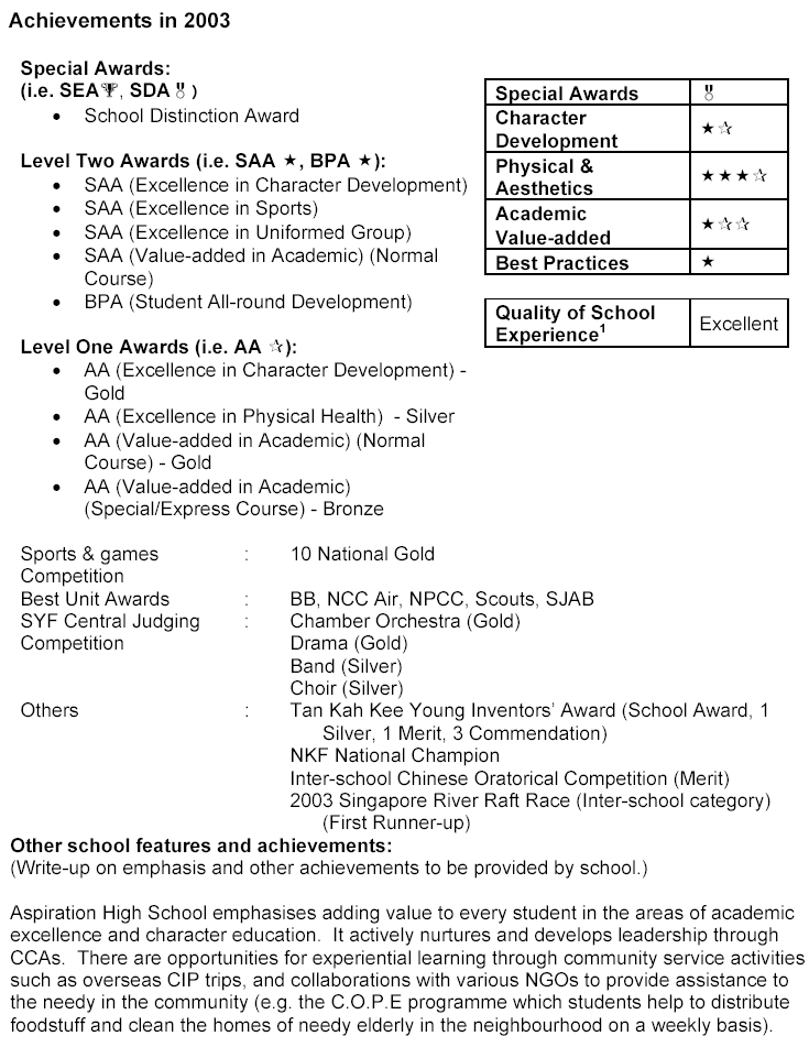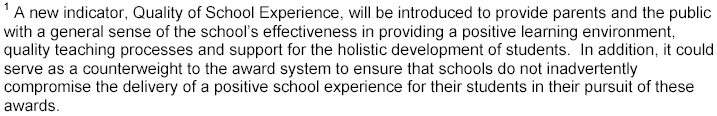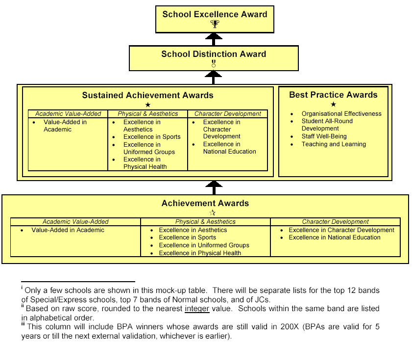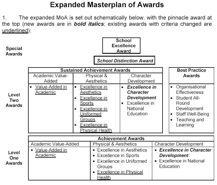 2. A new special award – the School Distinction Award – will be introduced to recognise high-achievement schools with exemplary school processes and practices. This new award would be pitched between the Level Two awards (Sustained Achievement Awards and Best Practice Awards) and School Excellence Award.
