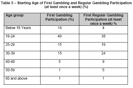 8. Some 63% of the respondents first gambled at 24 years old
