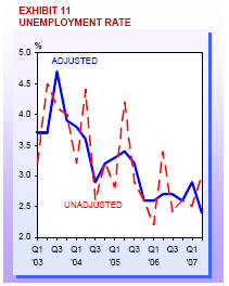 adjusted unemployment rate fell to 2.4% in June 07 from 2.9% March