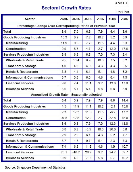 The Singapore economy expanded by 8.6% in 2Q07 following 6.4% in