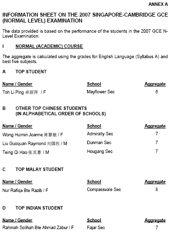Singapore-Cambridge GCE 'N' Level Exams 2007 Results