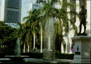 There is a fountain and a statue of Sir Stamford Raffles in front of the building.